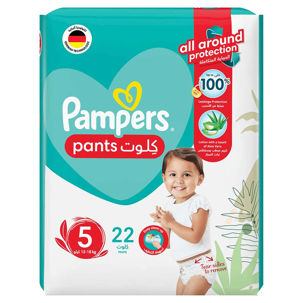 Size 5 pants with aloe vera lotion for babies 12–18 kg. Provide 12-hour leakage protection, soft feel, and easy removal with stretch design and roll-tape - 22 Diapers