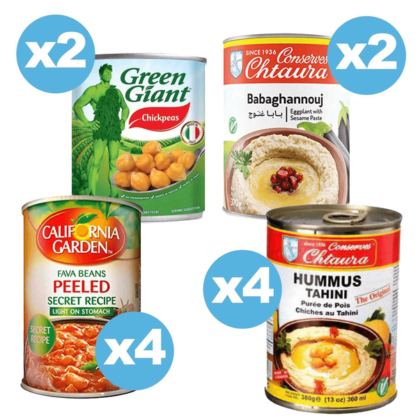Set Includes: Chtaura Hummus Tahina - 4 Pcs - 380 gm Chtaura Baba Ghanonouj - 2 Pcs - 370 gm California Garden Peeled Fava Beans Secret Recipe - 4 Pcs - 450 gm Green Giant Chickpeas - 2 Pcs - 400 gm