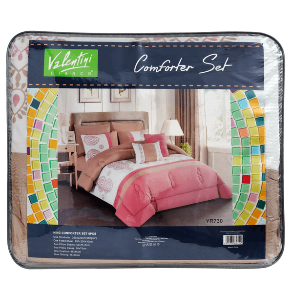 King printed comforter set includes: 1x King Comforter - 260 x 230 cm 1x Fitted Sheet - 200 x 200 cm + 30 cm 2x Pillow Shams - 50 x 75 cm + 5 cm 2x Pillow Cases - 50 x 75 cm 2x Cushion Color: Brown & Pink Model No. YR730