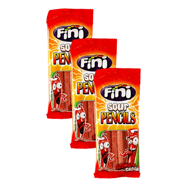 Fini Strawberry Pencils are long red candy pencils with a soft Sweet fondant candy filling. Perfect for sharing with your family, or as giveaways for your party guests- 3 × 100 gm
