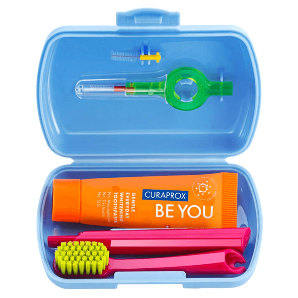A unique compact box containing fresh whitening 10 ml toothpaste and two interdental brushes with a handy holder for perfect oral hygiene wherever you go.