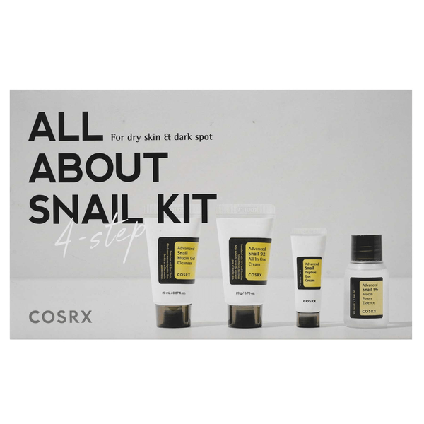 This set contains: Advanced Snail Mucin Gel Cleanser, Advanced Snail 96 Mucin Power Essence Serum, Advanced Snail Peptide Eye Cream, and Advanced Snail 92 All In One Cream - Set of 4