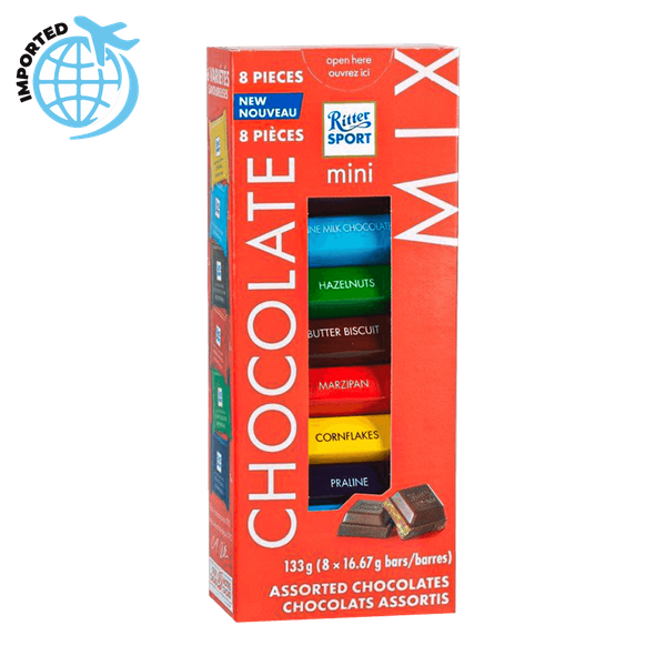 Contain 6 tasty flavors of mini chocolate bars of Marzipan Chocolate - 1 Piece Cornflakes Chocolate - 2 Pcs Alpine Milk Chocolate - 1 Piece Hazelnuts Chocolate - 1 Piece Butter Biscuit Chocolate - 1 Piece Praline Chocolate - 1 Piece