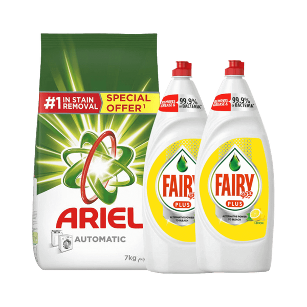 Ariel Automatic Green Powder Detergent (7 kg) - Fairy Plus Lemon Dishwashing Liquid (2 x 800 ml)