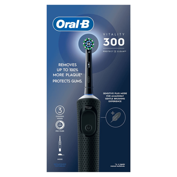 It offers a fundamental rechargeable option with a simple design in black, providing essential cleaning for those needing basic electric toothbrush functionality.