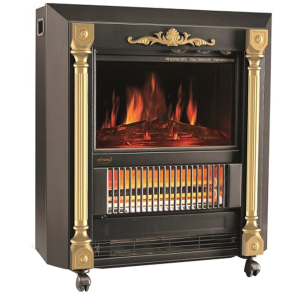 Real log flame effect, 3 heat stages (650/1350/2000), flame effect can be used separately, adjustable flame brightness, thermostat control, and safety thermal cut-off device. Power: 2000W, Color: Brown - Model No. NDY-20