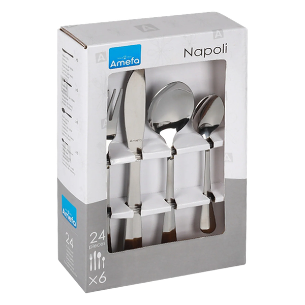 Made from high-quality chrome steel and dishwasher safe. Set Includes: Spoons (6 Pcs) - Tea Spoons (6 Pcs) - Forks (6 Pcs) - Knives (6 Pcs) - 24 Pcs
