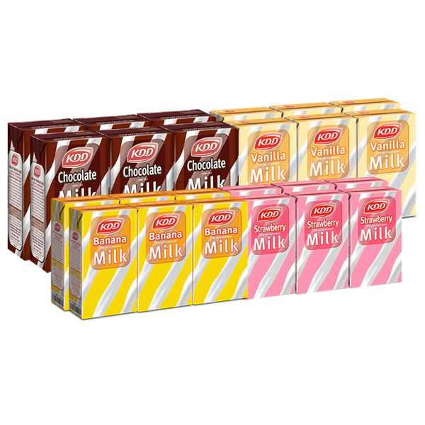 The bundle contains: KDD Chocolate Milk - (6 x 250 ml) - KDD Banana Milk - (6 x 250 ml) - KDD Vanilla Milk - (6 x 250 ml) - KDD Strawberry Milk - (6 x 250 ml)