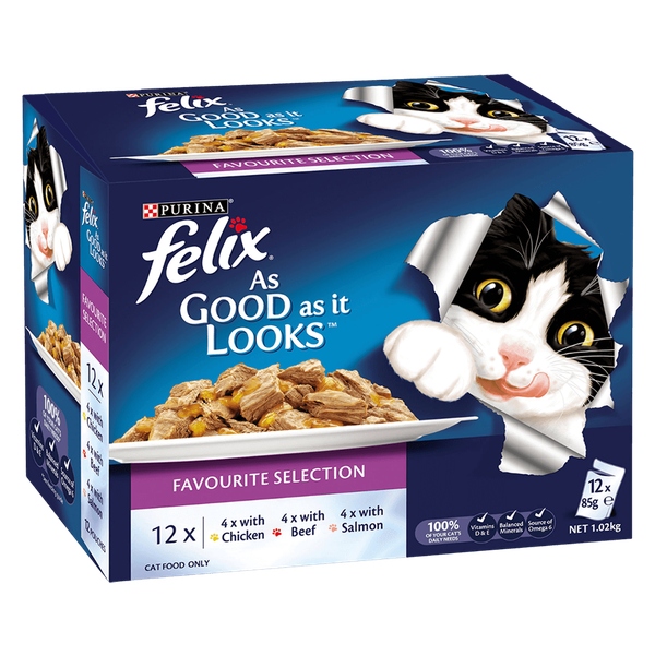 The food cat box contains: ( 4 Pcs ) Chicken Flavor Cat Food, ( 4 Pcs ) Beef Flavour Cat Food, ( 4 Pcs ) Salmon Flavour Cat Food - 12 x 85 gm