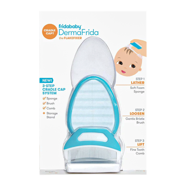 A three-step system designed to help treat and manage cradle cap in infants. This system includes a soft foam sponge, a gentle bristle brush, and a fine-tooth comb, collectively aimed at addressing the buildup of flakes on a baby's scalp.