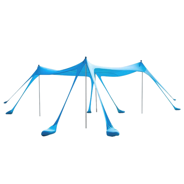 The beach canopy is perfect for beating Kuwait's heat! It measures 3 x 3 meters in width and depth, with a height of 2 meters. It includes 8 sandbags for stability against windy conditions. The cloth is made from 12% lycra and 88% terylene, and the poles are made of aluminum, ensuring great durability. It comes in a sky blue color.