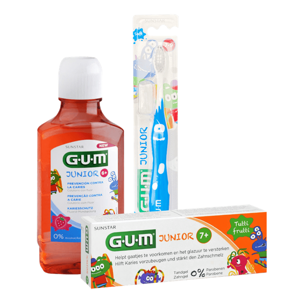 The bundle contains: Gum Junior Toothbrush (6-9 Years) - Gum Junior Mouthwash (300 ml) - Gum Junior Toothpaste (50 ml) - Set of 3