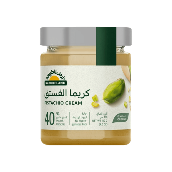 A smooth, indulgent spread made from organic pistachios, Natureland Pistachio Cream is perfect for spreading on toast or incorporating into desserts. Its rich, nutty flavor makes it a luxurious addition to any snack - 130 gm