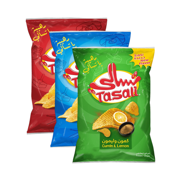 The set contains: Tasali Cumin & Lemon Chips (55 gm) - Tasali Chilli Chips (55 gm) - Tasali Ketchup Chips (55 gm) - 3 x 55 gm