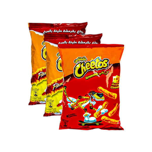 The set contains: Cheetos Crunchy Flamin' Hot Cheese Snacks (50 gm) - 3 x 50g