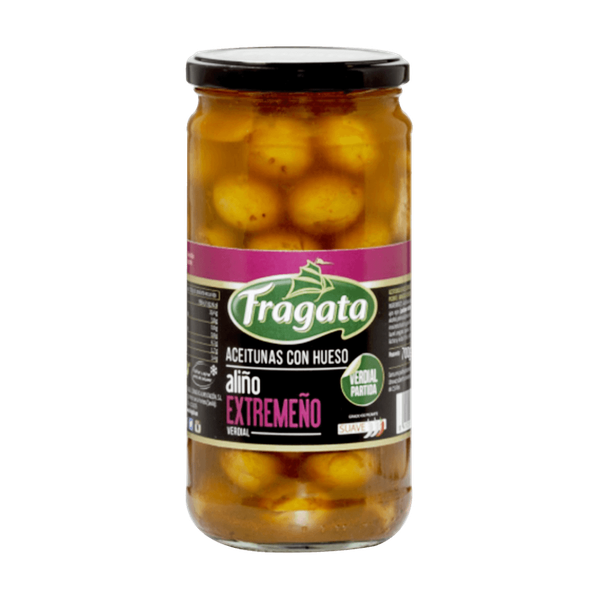 These cracked whole green Verdial olives are marinated with red peppers, red garlic, and a blend of spices, delivering a robust and savory flavor characteristic of Spain's Extremadura region - 340 gm
