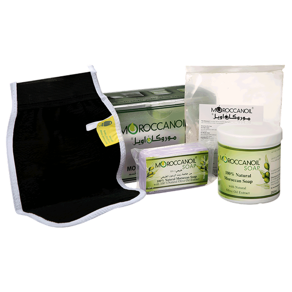 A complete Moroccan oil bath kit with essential items for a relaxing, nourishing, and rejuvenating bath experience