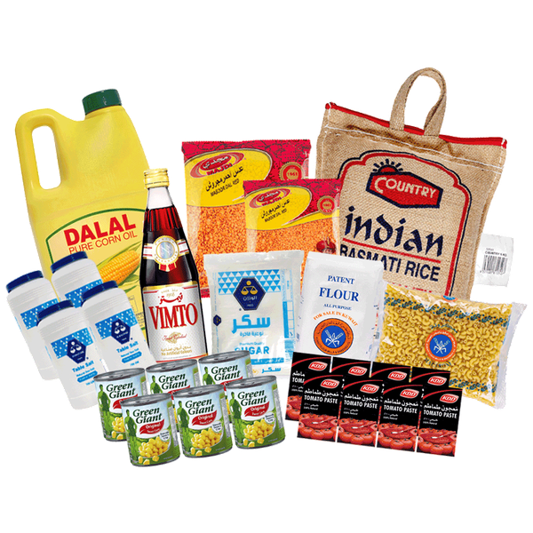 This box includes: KFM Patent Flour (1 kg), KDD Tomato Paste (8 x 135 gm), KFM No. 23 Macaroni (500 gm), Dalal Pure Corn Oil (2 L), Green Giant Original Sweet Corn (6 x 198 gm), Alwazzan Natural Table Sea Salt (4 x 700 gm), Majdi Red Lentil (800 gm + 350 gm), Country Indian Basmati Rice (5 kg), Vimto Concentrated Fruits Syrup (710 ml) & Alwazzan Sugar (5 kg)