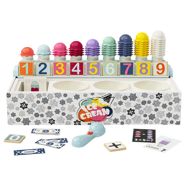 A pretend-play ice cream shop set that introduces kids to counting, colors, and role-playing, allowing them to build social and communication skills through imaginative play.