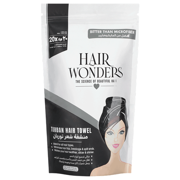 A fast-drying turban hair towel in black designed to absorb excess moisture efficiently reducing blow-dry time while preventing hair damage and maintaining softness - 25 cm x 65 cm
