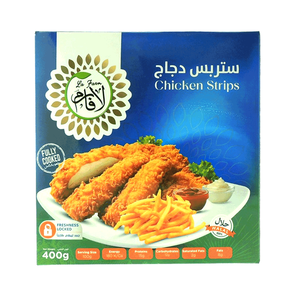 Crispy and tender frozen chicken strips made from high-quality white meat These strips are easy to prepare and perfect for wraps, salads, or dipping into sauces for a tasty snack or meal - 400 gm