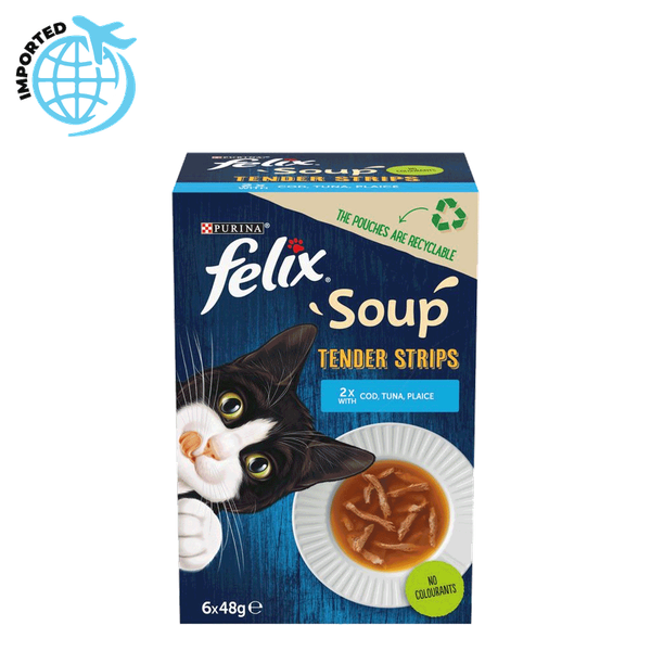 Tender soup strips made with a variety of fish selections immersed in a savory broth offering hydration and flavor for picky cats - 6 x 48 gm