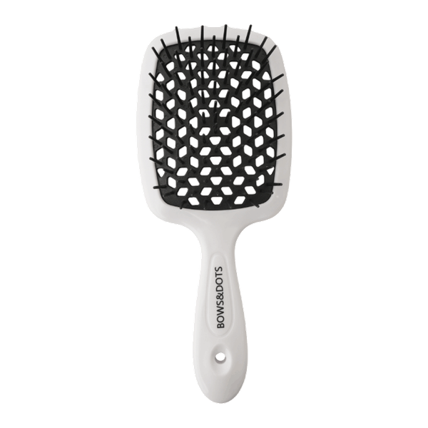 White black air hair brush combining lightweight design with soft bristles ideal for effortless styling drying and smoothing hair.