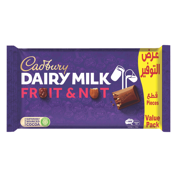 Fruits and nuts dairy milk chocolate bar offering a chewy and crunchy combo in a rich smooth cocoa base for balanced sweetness - 160 gm
