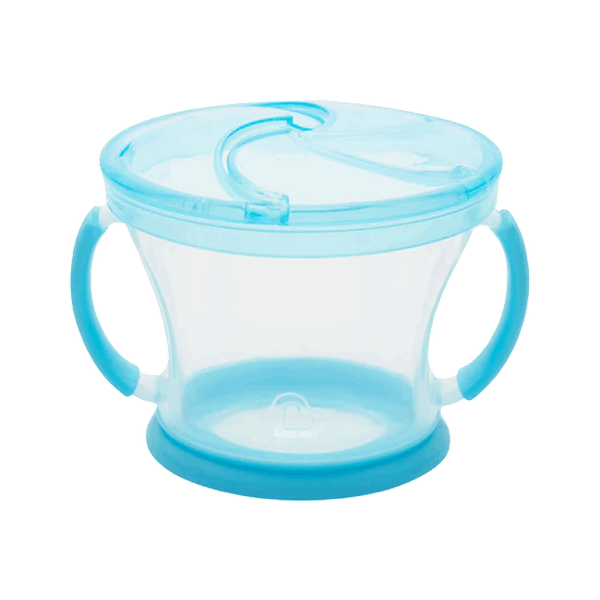 Snack container with spill-proof lid allowing easy access to snacks while reducing mess during travel.