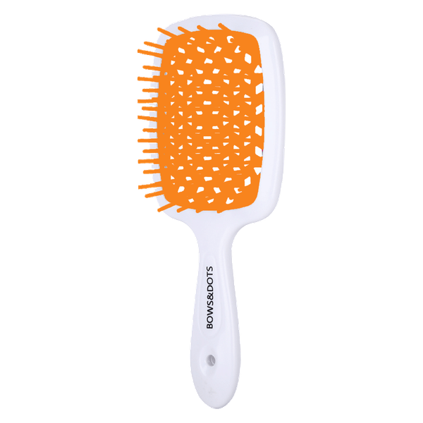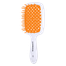 Scalp air brush in white and orange ideal for dry or wet hair detangling with cushioned bristles for comfort.