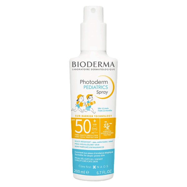 SPF 50+ pediatric spray offering high sun protection for sensitive baby skin with water resistance and lightweight formula - 200 ml