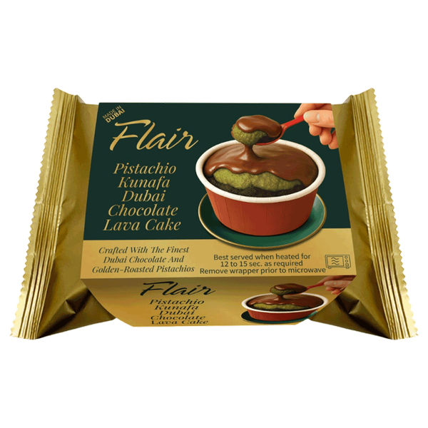 Lava cake with molten chocolate filling and pistachio flavor wrapped in crispy kunafa layers delivers indulgent sweetness with rich filling - 60 gm