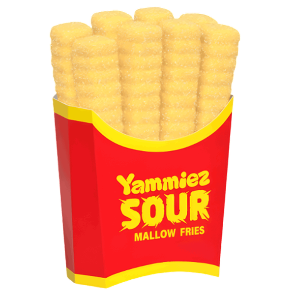 Soft and chewy marshmallow candies shaped like fries, coated with a tangy sour sugar for a sweet and sour treat experience - 44 gm