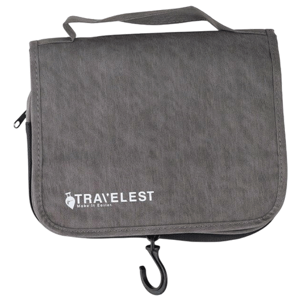 A toiletry bag made from water-resistant fabric and with multiple compartments that allow neat organization of toothbrushes, shampoo, grooming items, and other personal care products