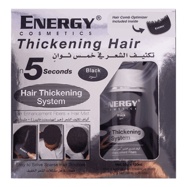 A hair thickening system that adds volume and density for fuller, stronger hair. The kit includes a hair enhancement fibers spray and hair mist