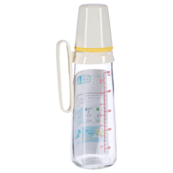 A glass nursing bottle with handles designed to support easy gripping and independent feeding for babies - 240 ml