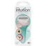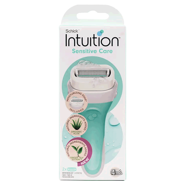 A razor features four blades encased in aloe vera and vitamin E, providing a smooth, moisturizing shave. Hypoallergenic and gentle, its pivoting head glides along body contours, lathers, and hydrates in one step while reducing irritation