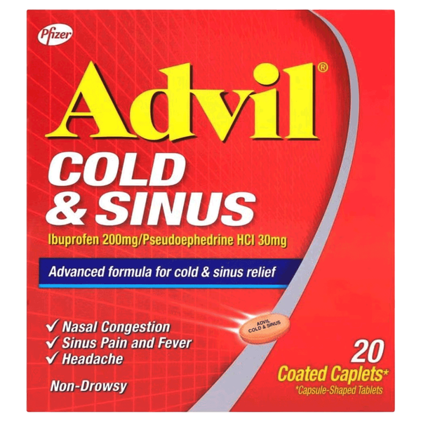 Oral tablets that are designed to relieve symptoms associated with cold and sinus issues, including headaches, sinus pressure, and nasal congestion. Combining ibuprofen for pain relief and pseudoephedrine as a decongestant, it provides fast and effective relief for adults and children 12 years and older - 20 Tablets