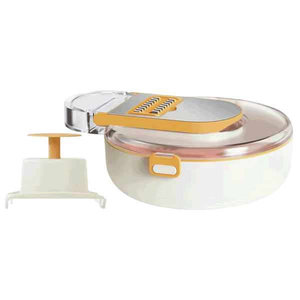 Includes: 1 mm shredding blade, 3 mm shredding blade, 36 mm x 36mm large dicing blade, 8 mm x 8mm small dicing blade, 12 mm x 12mm medium dicing blade, 2 mm slicing blade, Waffle blade, Colander and drain basket, Handguard for safet. Brush for easy cleaning
