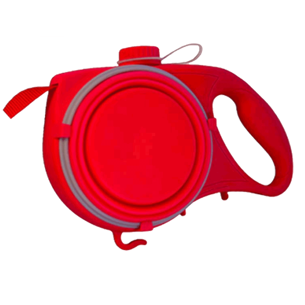 Includes a double-strength nylon leash with stainless steel catch, 350ml food-grade silicone water bottle, collapsible travel bowl for food and water, waste bag dispenser, and carrying hook