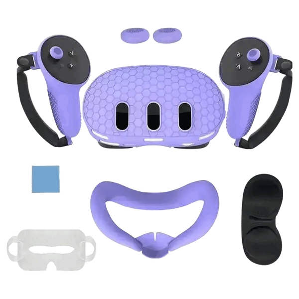 Silicone accessory kit designed to protect and Meta Quest 3, including protective covers and a practical storage bag.
