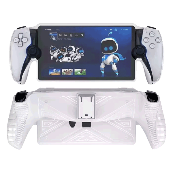 Durable protective case featuring an integrated stand, designed to safeguard the console and allow hands-free viewing.