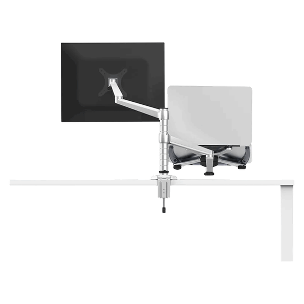 Versatile arm stand supporting both monitor and laptop, featuring full-motion adjustment and durable aluminum construction.