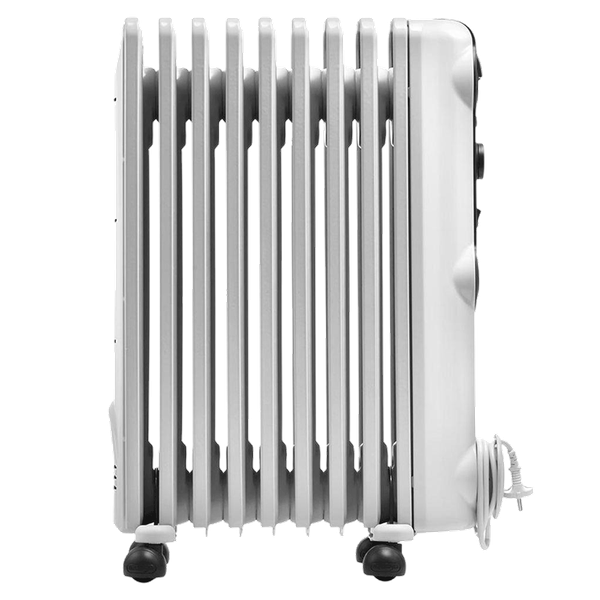 Oil-filled radiator heater delivering long-lasting and silent warmth for rooms up to 60 m³, featuring adjustable knobs for precise temperature and power control, Real Energy technology for efficient heating, and pre-assembled folding castors for easy movement - 9 Fins