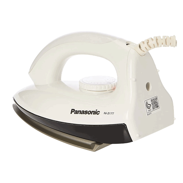 Panasonic 1200W dry iron featuring a Teflon non-stick soleplate, thermal fuse protection to cut power in case of overheating, automatic safety shut-off, and medium weight design for stable and efficient ironing.