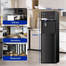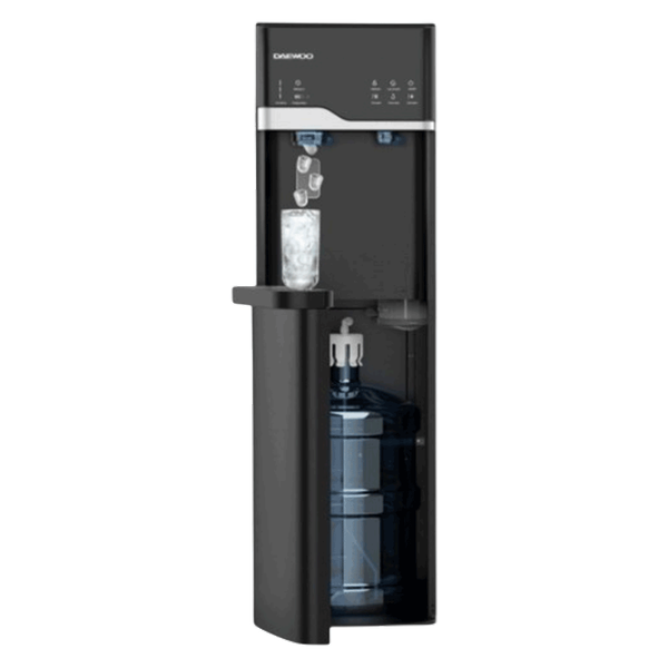 Bottom-loading freestanding water dispenser with compressor cooling, hot (with child lock), cold and room temperature options, stainless steel SS304 hot tank, PP cold tank, touch control panel, energy-efficient components, R600a refrigerant, and built-in ice maker with 2.5 L water tank capacity, ice production up to 10kg/24hr.- 540W