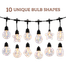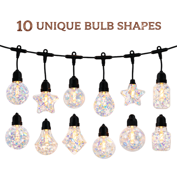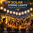 Create a cozy and charming outdoor atmosphere with decorative string lights featuring 10 artistic bulbs filled with reflective flakes for a sparkling effect. With 8 lighting modes, rechargeable solar-powered lights with USB backup, and automatic dusk-to-dawn operation, these waterproof lights are perfect for gardens, patios, balconies, pergolas, weddings, parties, and festive decor